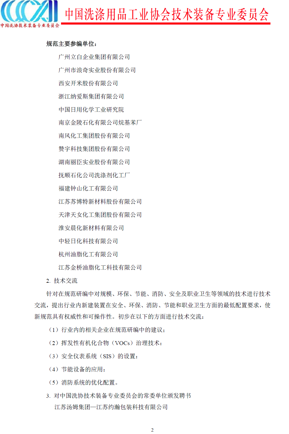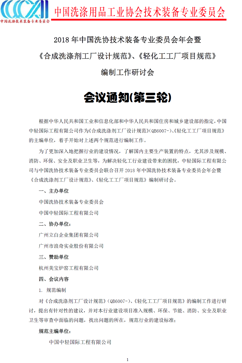 2018年中国洗协技术装备专业委员会年会暨《合成洗涤剂工厂设计规范》、《轻化工工厂项目规范》编制工作研讨会会议通知(第三轮)