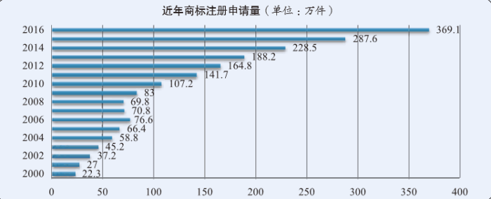 2016年是国家工商总局持续推进商事制度改革的一年,改革红利得到有效释放,市场活力得到有效激发,市场主体自主创新活力和商标意识不断增强,商标注册申请量继续保持较高增长态势。国家工商总局大力推进商标注册便利化改革,开拓创新,狠抓落实,拓展商标申请注册渠道,优化商标注册流程,完善商标审查机制,大力做好商标申请受理和注册审查工作。2016年商标注册申请量369.1万件,同比增长28.35%,已连续15年居世界第一位。
