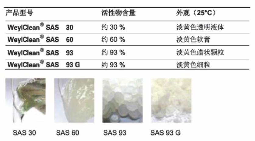 WeylClean SAS系列产品来自Weylchem公司,主要是由仲烷基磺酸钠组成的阴离子表面活性剂,具有生物降解性,适用于家具洗涤剂、化妆品和工业清洗领域。磺酸盐基团分布在碳链上,主要取代仲碳原子;因此,Weylchem SAS是多功能表面活性剂,有表面活性和良好的生理学及皮肤病学性能。