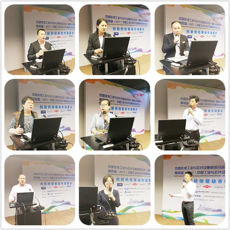 报告分别是北京安洁康生物科技有限公司研发经理高倩作《食品厂净化车间的空间消毒技术》、希悦尔(中国)有限公司洗衣房应用专家赵磊作《织物的消毒与卫生》、陶氏化学(中国)资深技术服务代表张洋作《商业洗衣配方中的泡沫控制》、诺维信(中国) 资深技术支持工程师刘洋作《商业清洁中的生物解决方案》、阿克苏诺贝尔化学品亚太区资深化学家姚永丽作《商业洗涤中浓缩化的解决方案》。