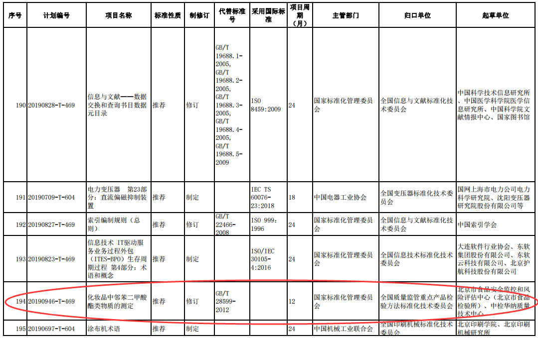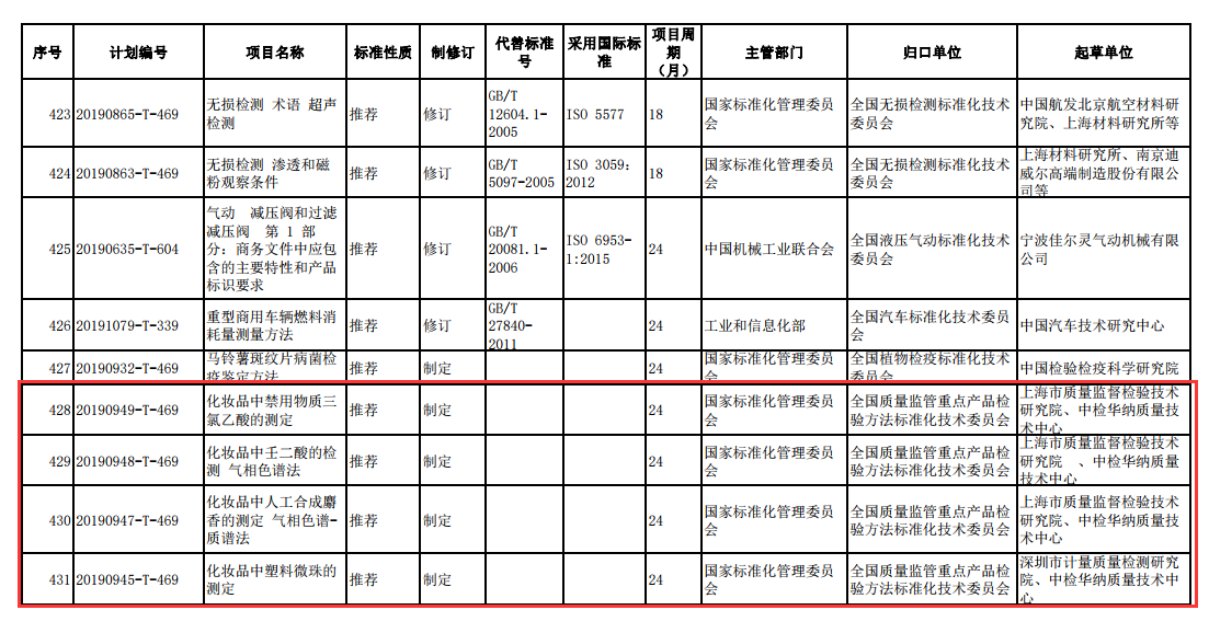 《化妆品中禁用物质三氯乙酸的测定》、《化妆品中壬二酸的检测 气相色谱法》、《化妆品中人工合成麝香的测定 气相色谱-质谱法》、《化妆品中塑料微珠的测定》