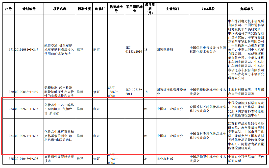 《化妆品中二乙二醇单乙醚的测定 气相色谱-质谱法》、《化妆品中林可霉素和克林霉素的测定 液相色谱-串联质谱法》